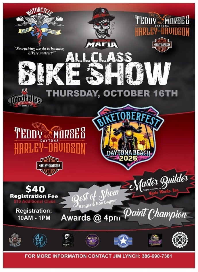 Bike Show Mafia All Class Bike Show sponsored by Motorcycle Safety Lawyers®, at Teddy Morse’s Destination Daytona. Registration 10am–1pm. Awards @ 4pm. 1637 N. US Hwy 1, Ormond Beach, FL 32174. (more…)