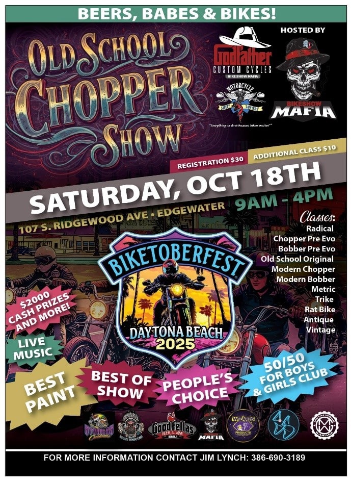 Bike Show Mafia Old School Chopper Show, Goodfellas Beer and Wine 107 S. Ridgewood Ave, Edgewater, FL. 9am-4pm (more…)