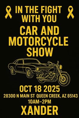 Bubbles, Bargains & Car and Motorcycle Show, For Xander family. 28300 N. Main St., Queen Creek, AZ 85143. 10am-2pm (more…)