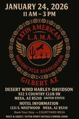 LAMA Gilbert New Year’s Kickoff Party. Desert Wind Harley-Davidson, 922 S. Country Club Dr., Mesa, AZ 85210. 11am-3pm. (more…)