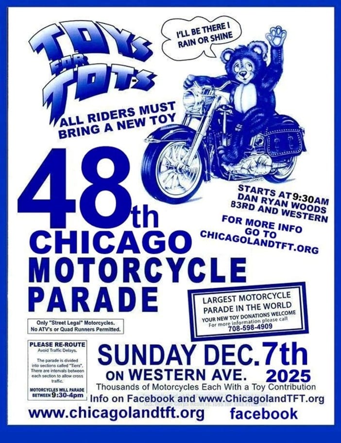 Chicagoland Toys for Tots Motorcycle Parade – 48th Annual Chicago Motorcycle Parade. Starts at 9:30 at Dan Ryan Woods, 83rd and Western. Don’t forget to bring a New Toy. (more…)